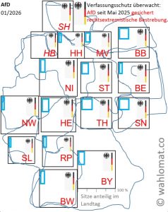 In den aktuellen Umfragen gewinnt die AfD +7,98 % bzgl. der letzten Landtagswahlen, gewichtet nach Wahlberechtigten** (Stand 05.02.2026). Die Partei vom Verfassungsschutz als gesichert rechtsextremistische Bestrebung geführt und überwacht. In den ehemaligen ostdeutschen Bundesländern (Bevölkerungsanteil 14,9 %) ist die Partei überrepräsentiert und erzielt dort aktuell 36,2 % der Wählerstimmen. In den ehemaligen westdeutschen Bundesländern erhält sie aktuell 18,0 % der Wählerstimmen.