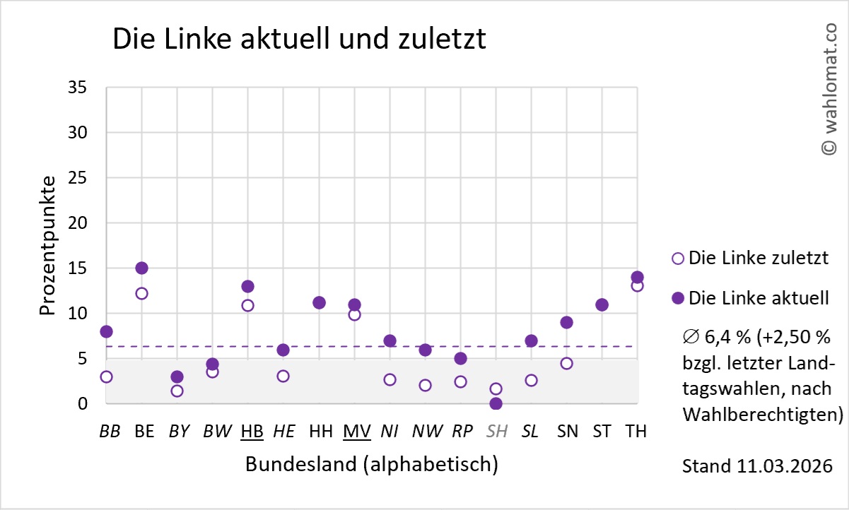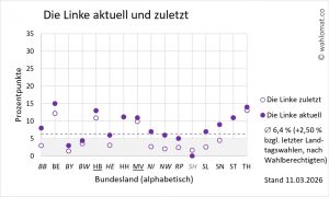 In den aktuellen Umfragen gewinnt die Linke +2,50 % bzgl. der letzten Landtagswahlen, gewichtet nach Wahlberechtigten** (Stand 11.03.2026). In fünf von 16 Bundesländern steht die Partei an oder unterhalb der 5 %-Grenze. In den Stadtstaaten und den ostdeutschen Bundesländern ist die Partei überrepräsentiert. In neun von 16 Landtagen ist die Partei nicht vertreten.