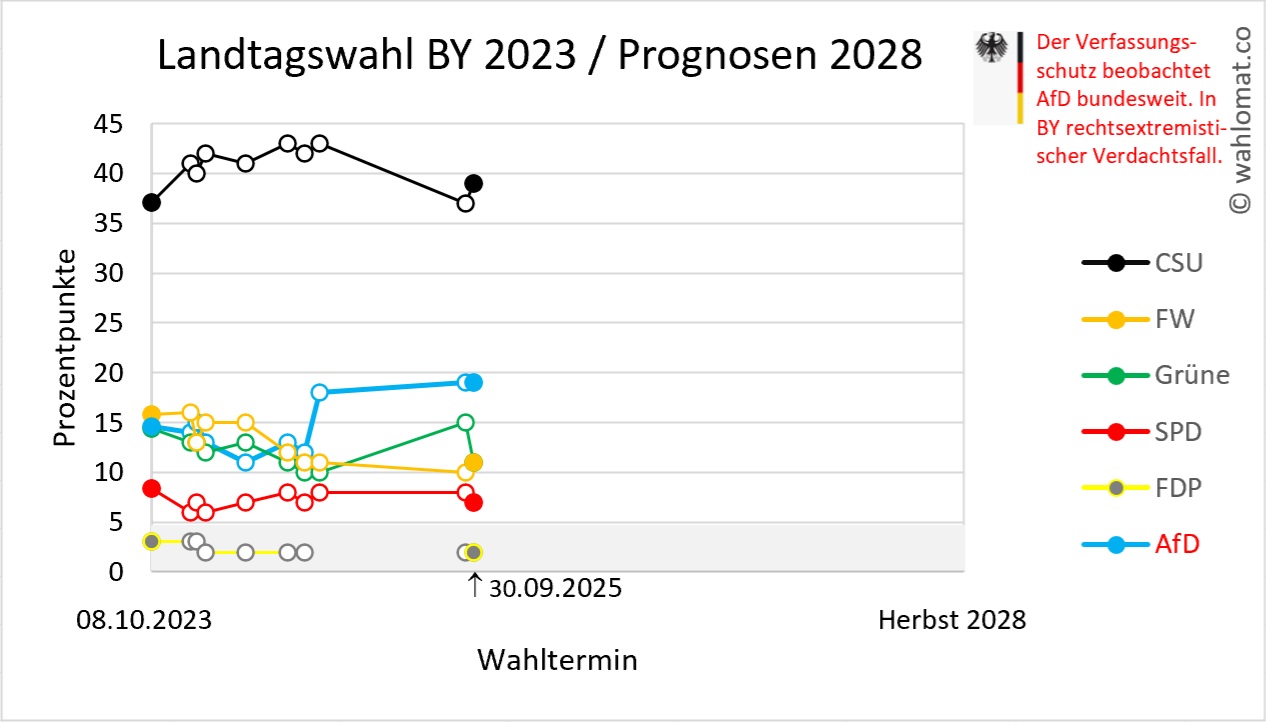 Wahlumfrage Bayern: Letzte Wahlprognose vom 30.09.2025/GMS (Stand 22.10.2025):