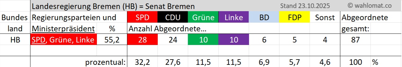 Gemessen an der Einwohnerzahl steht die Hansestadt Bremen als Stadtstaat HB am Ende der 16 Bundesländer und hat nur gut halb so viele Einwohner wie das kleinste Bundesland, das Saarland SL (siehe Landtagswahlen: Bundesländer im Vergleich).