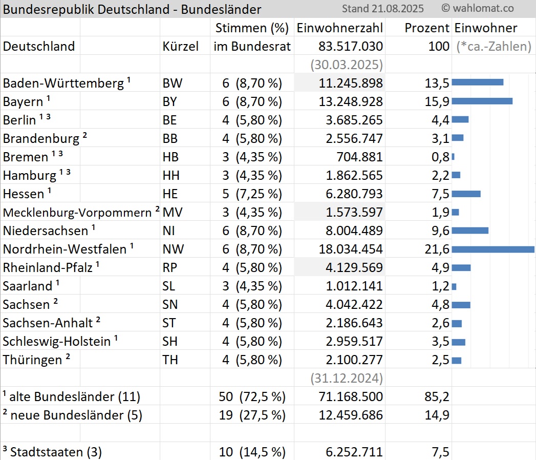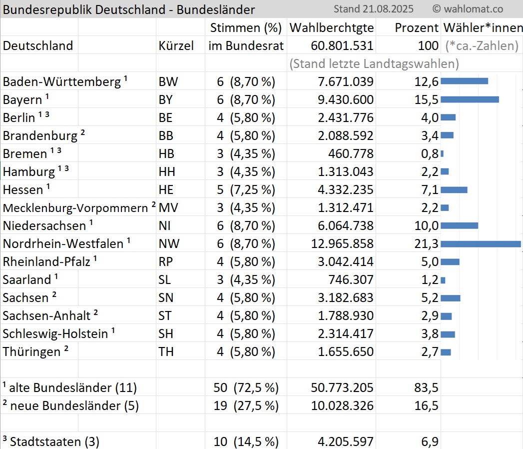 Obige Grafik zeigt eine aktuelle Übersicht der Landesregierungen der 16 Bundesländer und deren Stimmgewichte im Bundesrat. Länder mit hohen Einwohnerzahlen (Wahlberechtigten) verzichten dabei zugunsten der Länder mit niedrigeren Einwohnerzahlen (Wahlberechtigten) auf Stimmgewichte nach tatsächlichen Zahlen. So erhalten die drei Stadtstaaten (BE, HB, HH) insgesamt 14,5 % der Stimmen im Bundesrat, obwohl ihr Bevölkerungsanteil aktuell nur 7,3 % der Gesamtbevölkerung (6,9 % der Wählerstimmen) ausmacht. Gleiches geschieht bei den neuen Bundesländern (BB, MV, SN, ST, TH): sie erhalten 27,5 % der Stimmen im Bundesrat bei einem aktuellen Bevölkerungsanteil von nur 14,9 % (16,5 % der Wählerstimmen).