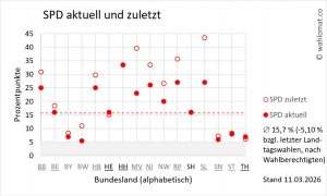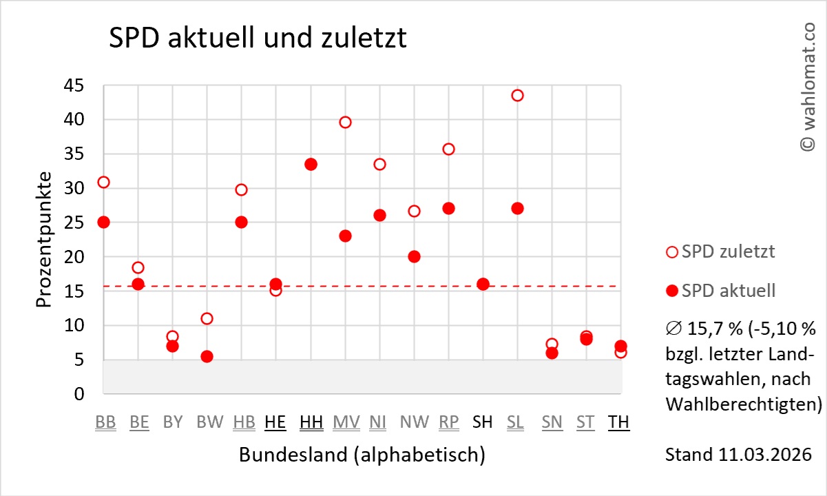 In den aktuellen Umfragen verliert die SPD -5,10 % bzgl. der letzten Landtagswahlen, gewichtet nach Wahlberechtigten** (Stand 11.03.2026).