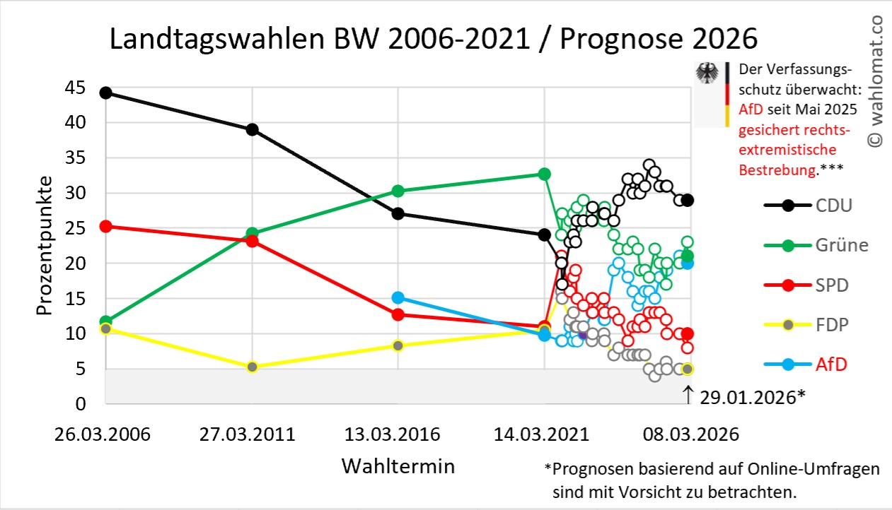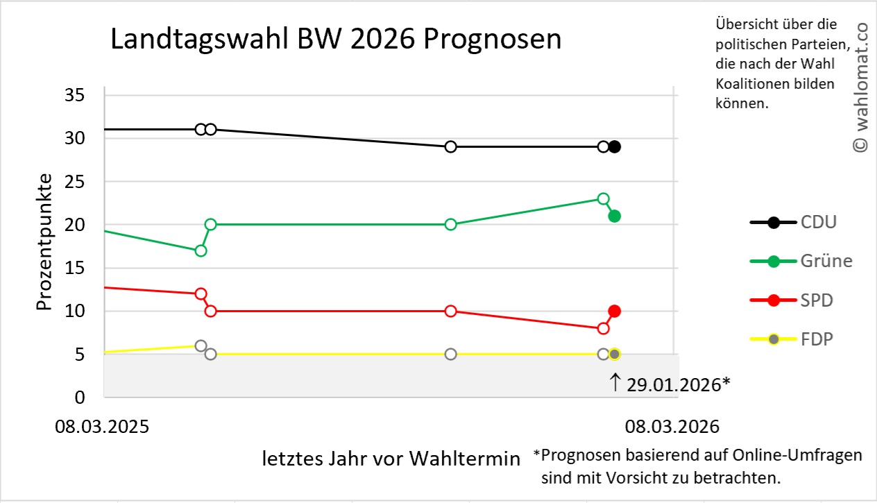 Wahlumfrage Baden-Württemberg: Letzte Wahlprognose vom 29.01.2026/INSA(NIUS)*: