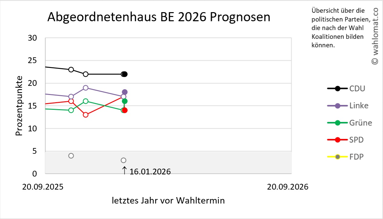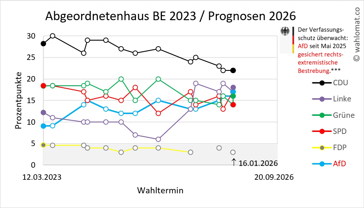 Wahlumfrage Berlin: Letzte Wahlprognose vom 16.01.2026/Infratest dimap (Stand 14.02.2026):