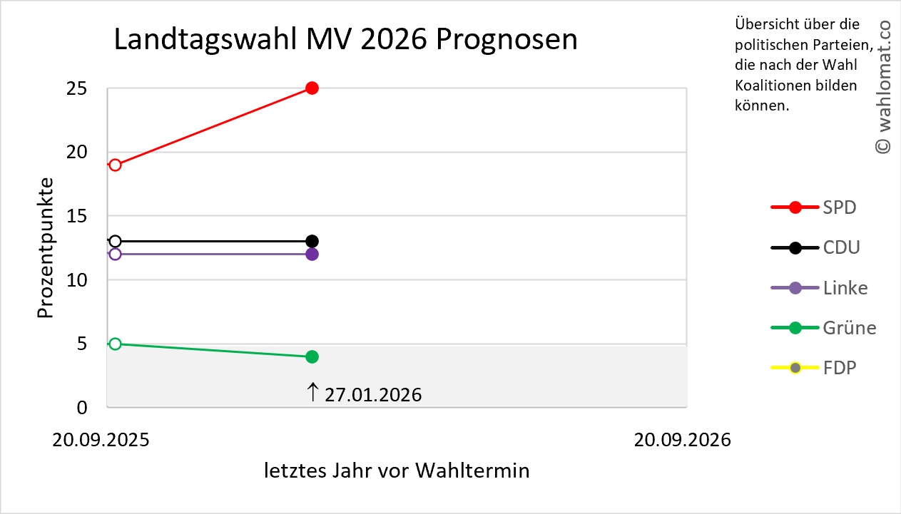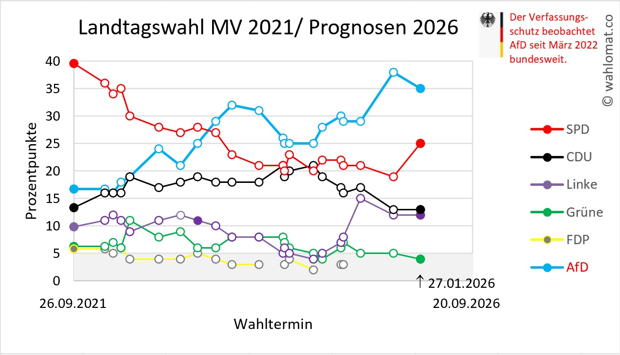 Wahlumfrage Mecklenburg-Vorpommern: Letzte Wahlprognose vom 27.01.2026/Infratest dimap (Stand 14.02.2026):